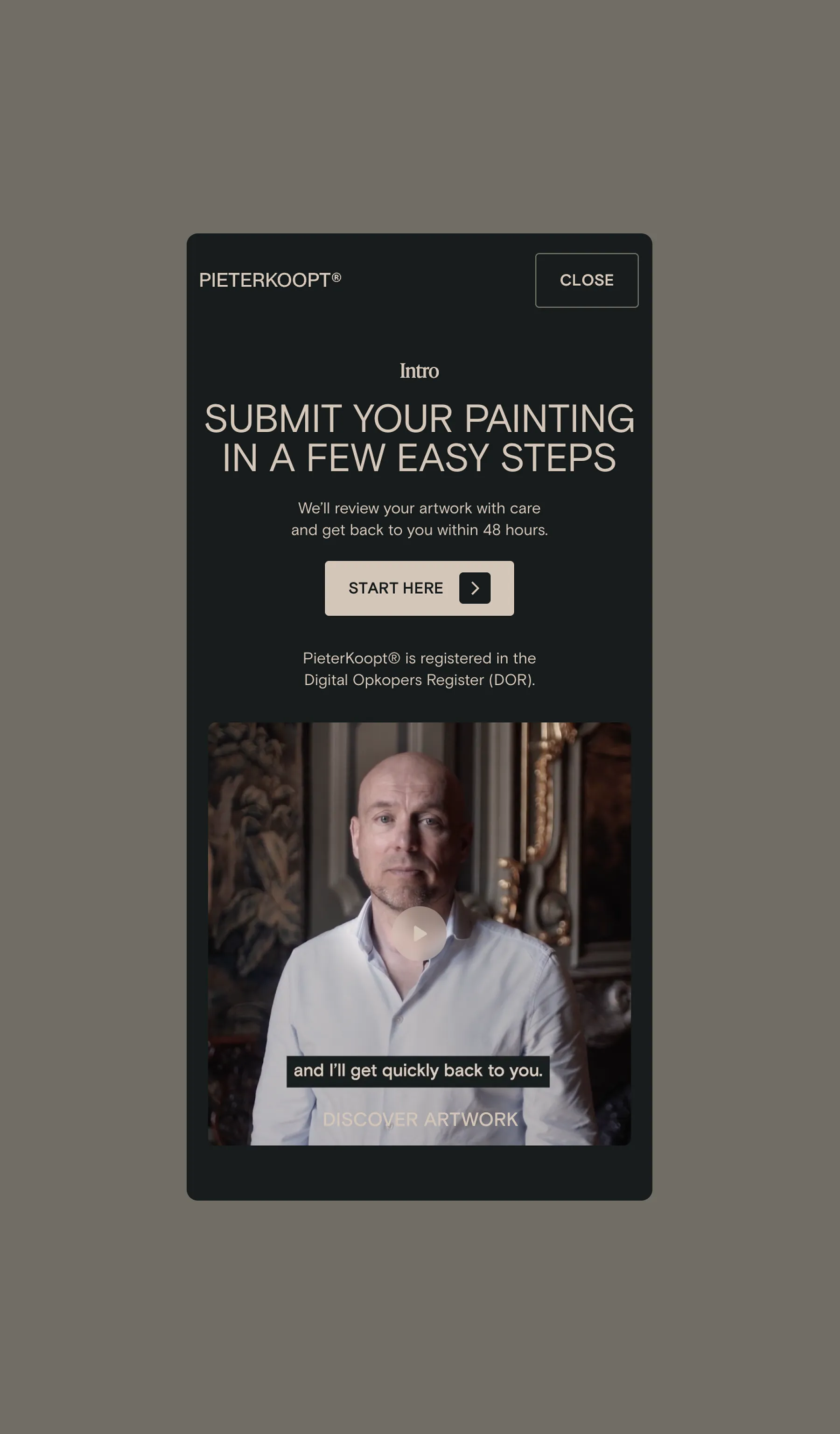 An important part of the website is the submission flow. Above all, it had to feel approachable. Not complicated or distant, but a clear route where visitors can quickly and easily submit their painting for a review and a personal offer from Pieter. That is why we designed a flow that feels familiar and guides visitors step by step. Accessible in use, clear in structure, and fully focused on removing doubt. In this way, the digital experience connects seamlessly to the brand promise: personal, transparent, and commission free. Submitting art no longer feels like a big step, but like a natural next one.